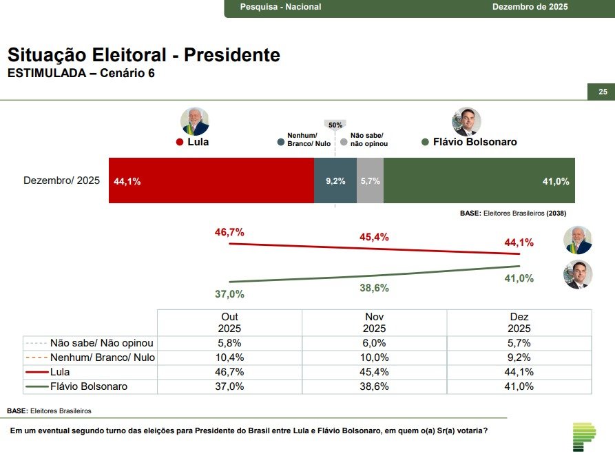 Em termos práticos, Lula perdeu mais de 2,5 pontos percentuais no período, enquanto Flávio avançou 4 pontos. Hoje, a diferença numérica entre os dois é de apenas 3,1 pontos, o que, dentro da margem de erro, coloca a disputa em aberto.